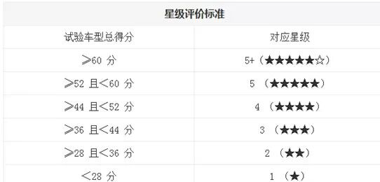 C-NCAP评分规则非常细致严格,碰撞星级共划分为5+星级、5星级、4星级、3星级、2星级、1星级6个等级。达到5星标准不仅要求试验得分要≥52,还要求在正面100%重叠刚性壁障碰撞试验、正面40%重叠可变形壁障碰撞试验、可变形移动壁障侧面碰撞试验三项试验中,前排假人的特定部位(头部、颈部、胸部、腹部和骨盆)不能为0分。