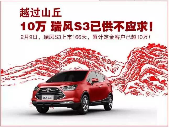 瑞风S3上市以来持续热销,已连续多月夺得小型SUV的冠军,1月销量突破2万台。由于产能受限,供销缺口一直在2万台以上,春节前依然有部分客户无法交车。 城市易驾SUV,瑞风S3现车充足,欢迎前来抢购,参与2月18、19日(农历大年三十,大年初一)集中交车,即可尊享千元神秘大礼和超值装潢大礼包