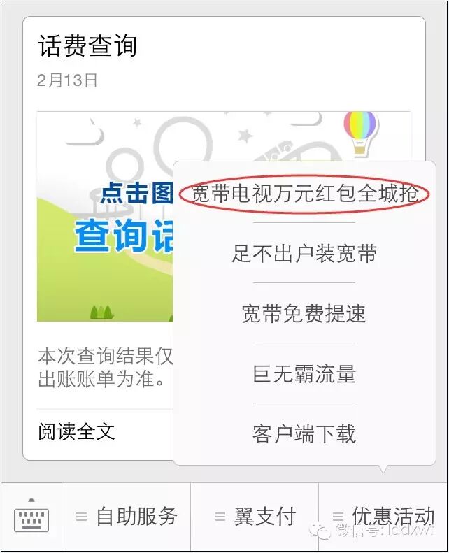 为庆祝六安电视台成功接入电信宽带电视,现举行电信宽带电视万元红包全城抢活动! 即日起至本月月底,电信用户微信关注中国电信六安网上营业厅即可参与我们的抢红包活动!只要你答对我们提出的简单问题,就有机会赢取10-30元翼支付红包现金和360WiFi等好礼!奖品天天送,名额有限,先到先得!快来参加吧! 已关注此微信号的朋友,直接在菜单栏中点击“优惠活动”,再点击“万元红包全城抢”,即可参与,未关注的朋友请先关注次微信号—中国电信六安网上营业厅(ladxwt)。 活动时间:即日起至2015.2.28 活动奖品(每天送出)