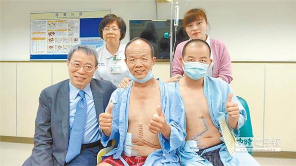 吴祯翔(前中)因肝癌合并肝硬化、B肝,需要进行肝脏移植,他的三儿子吴立榤(前右)中签、顺利捐肝给父亲,在中国附医器官移植中心院长郑隆宾(前左)主刀下,父子恢复良好。(林欣仪摄)