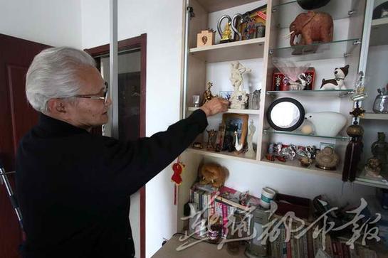 每到一个地方张家振老人都会买件纪念品放在家中,如今架子上摆满了各式各样的旅游纪念品 张家振说,妻子劳累了一辈子,哪也没去过,凡是自己去过的地方一定要让她去看看。妻子杜培坤患有腿疾,不宜长时间走路,并且他们喜欢无拘无束的游览方式,就这样,在张家振69岁高龄学会驾车后,妻子杜培坤就坐在车内后座上,看着窗外的风光,随着张家振北上南下。 为弥补妻子哪也没去过的遗憾 4月3日下午,记者来到张家振、杜培坤夫妇家中,见到了两位老人,均是满头白发,却精神矍铄。张家振戴着一副眼镜,身材消瘦,挺得笔直,花白的头发梳理得一丝不苟,说话不紧不慢,一副儒雅老者的风度。杜培坤因患有关节炎,行动略显迟缓。 待记者刚坐下,两位老人便告诉记者,前几日刚结束了安徽访故之行。接着,就向记者介绍这次安徽之行,“你们有机会一定要去宏村、西递,桃花源里人家,白墙黑瓦,太漂亮了。”显然两位老人还沉浸在这次安徽之行中。