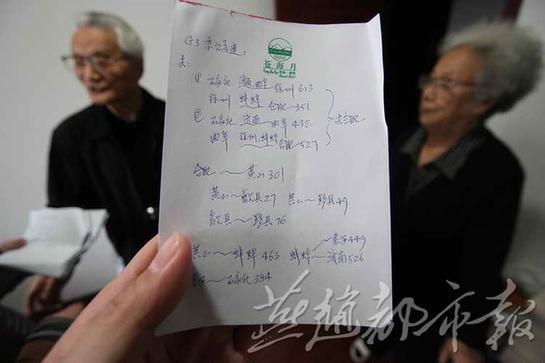 二老的某次行程计划表 出发前制定详细路线图 俗话说,磨刀不误砍柴工,对于二人来说,旅行前做好缜密的旅游计划以及出行准备尤为重要。每次出发前,张家振都要把车子开到4S店,做一次全面保养,避免车子在途中出现故障。此外,就是要制定详细的行车路线。张家振书柜上有一本厚厚的交通旅行图册,每次在确定目的地后,张家振就会仔细翻阅图册,把行车路线写出来。记者看到了本次安徽之行的路线图。行车路线密密麻麻,十分详细、清晰,通过路线图可以读出,出发地为石家庄,目的地为黄山,途径济南、泰安、曲阜、徐州、宿州、蚌埠、合肥、铜陵,首站景区在合肥,为此,张家振根据途径城市路线长短,制定了两个不同方案来供途中休息。此外,记者注意到,途径城市之间,城市和每个要观赏景点之间的距离也标记了出来。“每次制定路线都要花费好几天,还要不停的修改、完善。” 根据制定的路线图,二人每天要行驶五六百公里的路程,晚上就在途径城市休息。杜培坤说,为了缓解张家振驾驶的疲劳,自己会特意找一些条件好点的酒店,而入住酒店除了看酒店大楼外观是否大气高档外,自己还会在网上看网友对于酒店的入住评价。因为出发之前的准备工作做得充分,二人的自驾游从没出现什么问题。