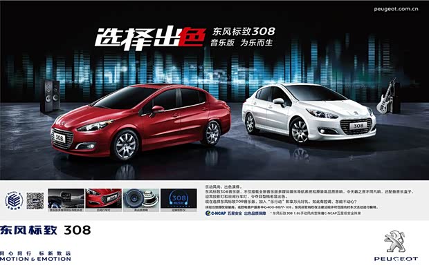 2015年6月28日,东风标致308音乐版正式上市。308自2011年上市以来凭借风尚的外型和高品质的造车理念成为中级车市场“风尚标杆”,此次音乐版车型的推出更是将风尚与品质再次提升。音乐版车型增配音乐导航、高品质音响、日间夜行灯、迎宾投影灯和音乐盒子,进一步提升了整车魅力,并以“选择出色”的姿态,为“自信进取的社会精英”们增添了最出色的魅力之选。