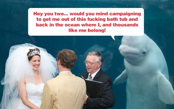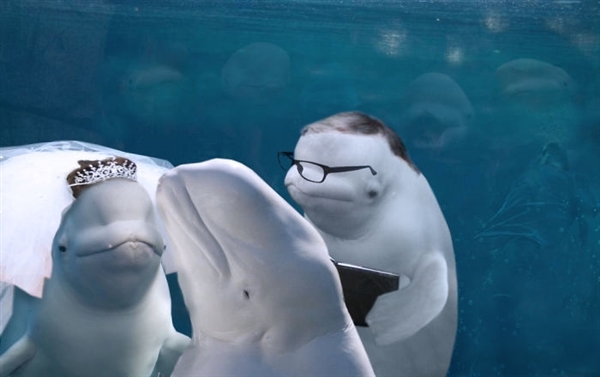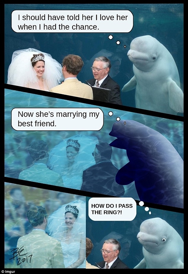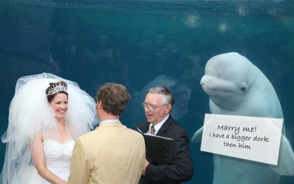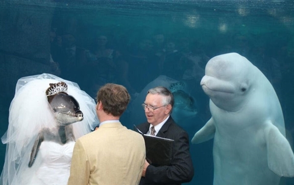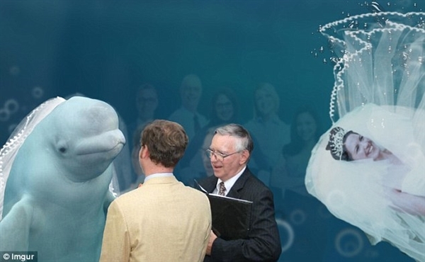 有网友将这张照片传到了Reddit社区的PS挑战板块,结果引来了一群脑洞大开的PS爱好者,有人把白鲸与新娘凑成了一对,还有人把白鲸与新郎组成了couple……一起来感受下吧。