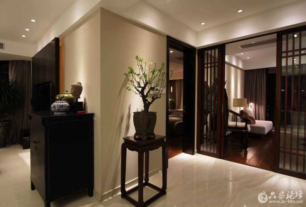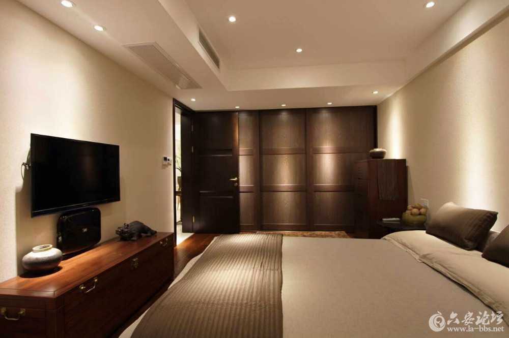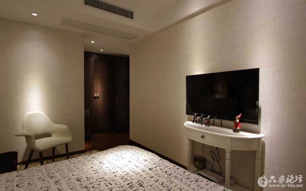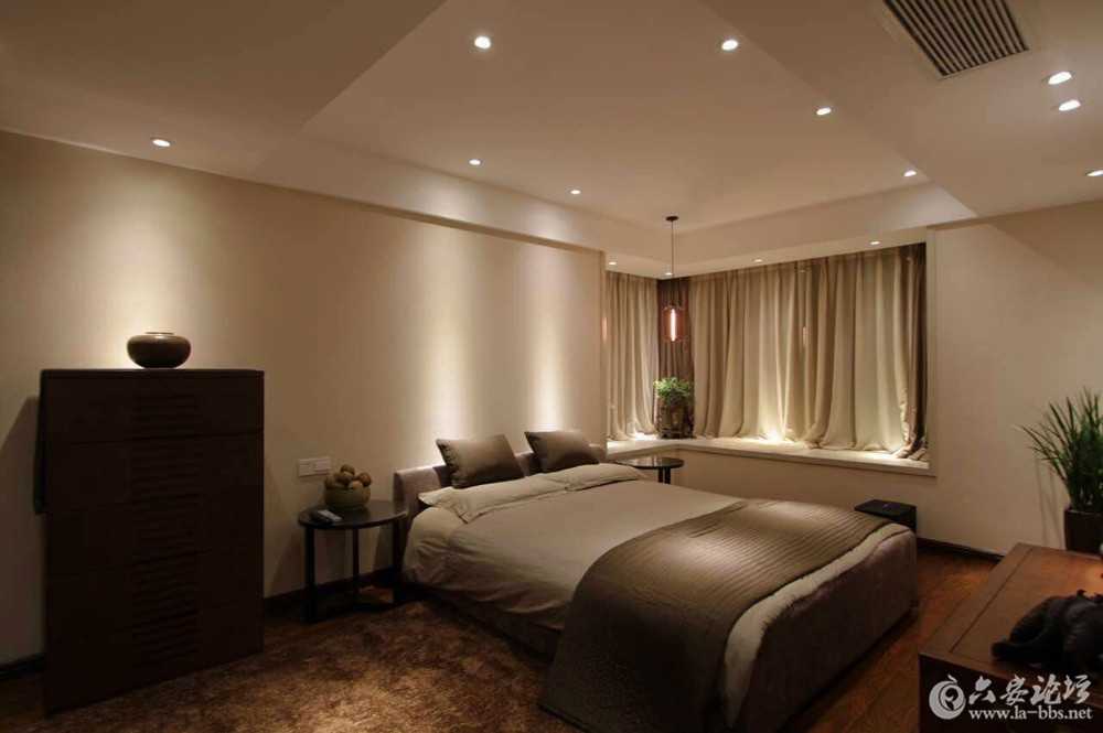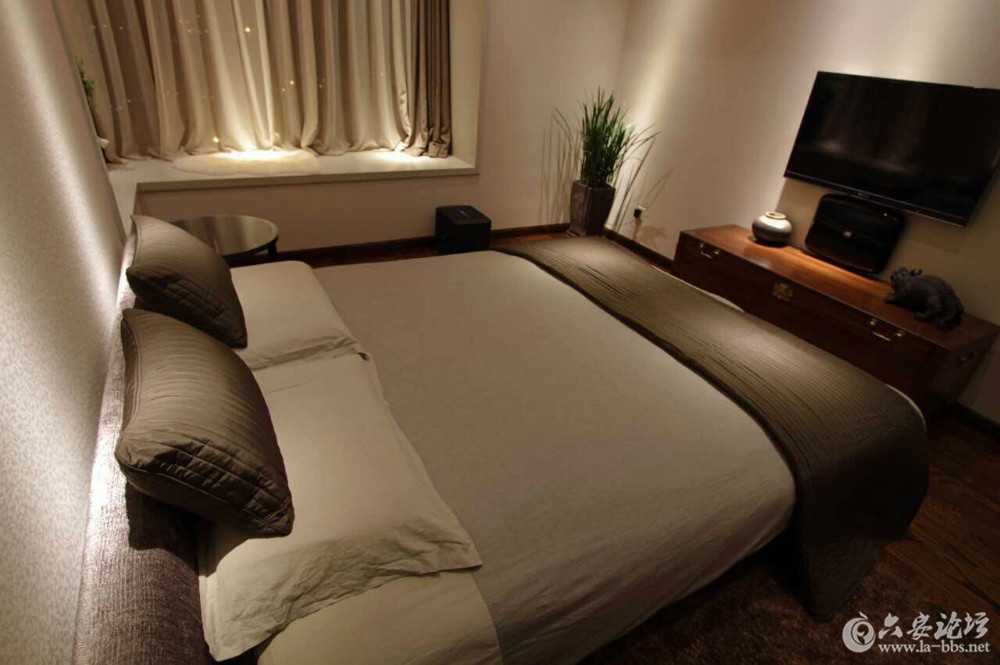 灯光,斜打在盆景等装饰物品上,是不是给你呈现出了一种很强立体的感觉。下面的案例把重点照明完全突现,如电视、窗帘、绿植、床头、床尾、休闲椅等,明暗分明,同时也增加了立体感。