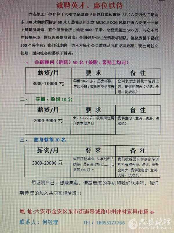 诚聘英才 虚位以待六安梦工厂健身位于六安市皋城路中州建材家具市场3F(六安万达广场向东300米朗庭国际后50米)。装修延用北京MUSCLE DOG风格打造六安唯一一家主题健身场馆,整个健身会所占地近4000平米,总投资超过500万。与众不同的锻炼环境;国际顶级健身设备;全国健身先生坐镇教练团队;健身房楼下设有300个停车位;我们创造的一切只为每个会员梦想从我们这里起航!现公司创立初期,面向社会招募以下精英:会籍顾问(销售)50名(兼职、暑期工均可)| 薪资/月 | 要 求 | 备 注 | | 4000-10000元 | 年龄18-28岁,男女不限,学历不限;如果你不怕吃苦 | 公司负责安排统一培训上岗,提供住宿舍(空调、洗浴、洗衣机) | 客服、收银10名| 薪资/月 | 要 求 | 备 注 | | 2000-3000元 | 女,18-25岁;收银岗位需六安本地户口 | 提供住宿(空调、洗浴、洗衣机) | 健身教练20名| 薪资/月 | 要 求 | 备 注 | | 4000-20000元 | 体育院校毕业;从事过私人教练;男身高170以上;女身高160以上 | 我们教练团队和多家培训机构长期合作;培训、提升空间大;提供住宿舍(空调、洗浴、洗衣机) |