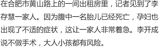 在医院检查时发现,其中一个胎儿已经死亡,如今孕妇也出现了身体不适的情况,正在合肥寻医。可是这十多天里辗转了多家医院,始终没有一家医院愿意接收。
