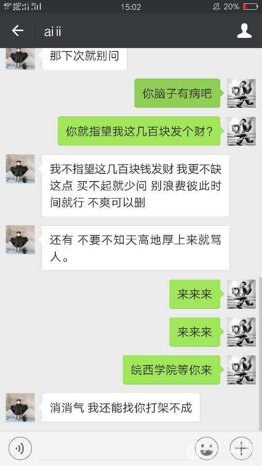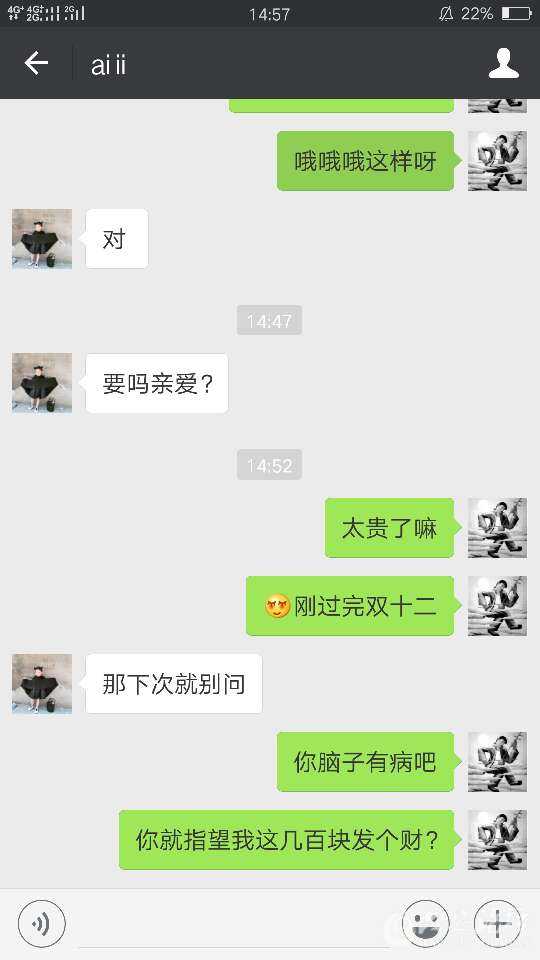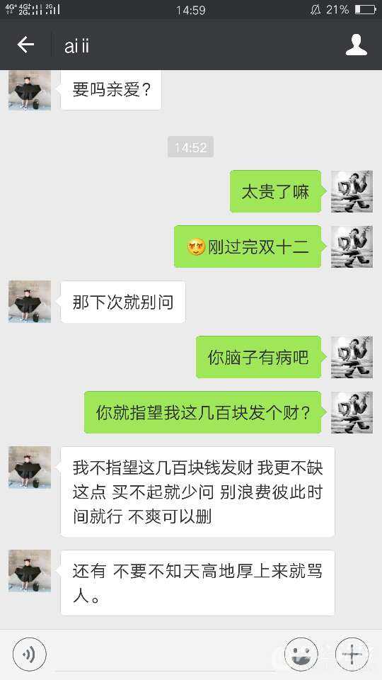 这家微信呢,是之前在她家买衣服时她自己要求我们加的,加完后,朋友圈也都是她的卖衣服的视频,今天下午看到她发的一件衣服的视频,准备问价格,在朋友圈下方问完价格后 ,她主动私聊我告诉我了价格,刚开始语气很客气,但看我觉得贵,语气就突变,说:那下次别问了,然后我就觉得莫名其妙,问她是不是有病,然后她更奇葩,说买不起就别问!