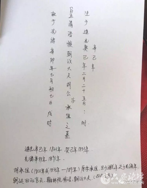 史载其是:皇清诰授朝议大夫胡公(字承组)之墓……清朝四品官职……卒于光绪辛卯年七月初七(1891年7月初7),生于道光×巳年(辛巳1821或葵巳年1833或乙巳年1845)。