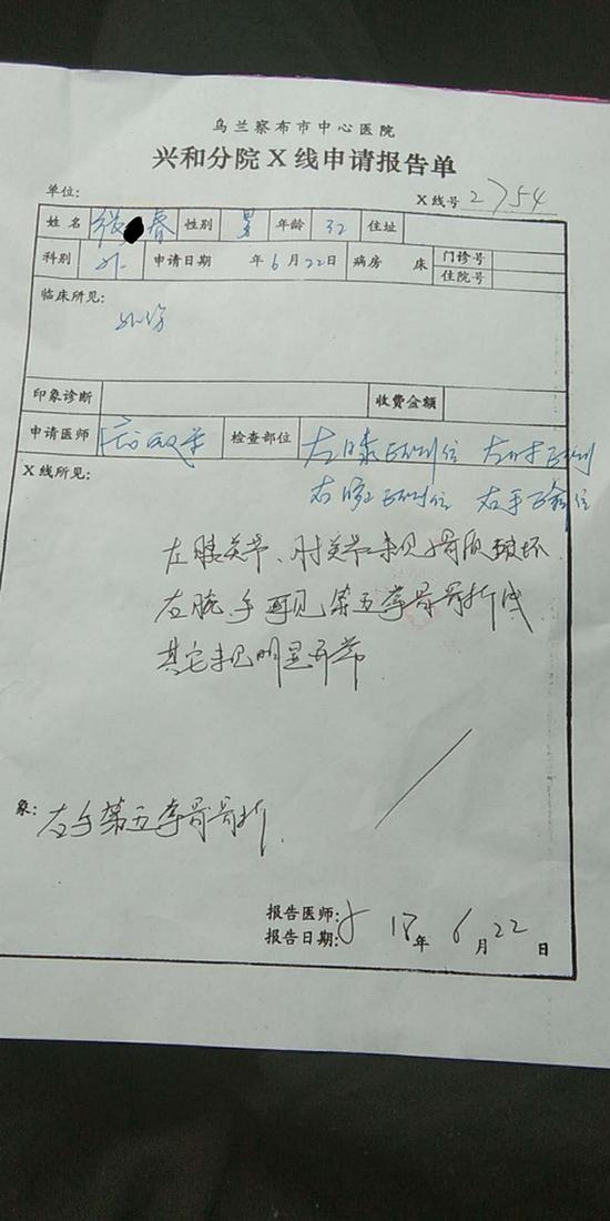 记者核实:上述单位确有其人 6月25日,法制晚报记者先后致电内蒙古自治区乌兰察布市兴和县的卫计局和供电公司,向这两个单位求证是否有涉事的工作人员。 乌兰察布市兴和县卫计局办公室的工作人员在被问及是否有马X海时,回答称该局是有叫马X海这个工作人员,该同志具体负责健康教育的工作。由于不在一起办公,所以办公室并不知道该人是否前来上班,对于其是否在烧烤店打架也并不知情。 乌兰察布市兴和县供电公司办公室工作人员在接受记者采访时表示,该单位确实有叫马X龙的工作人员,马X龙是该单位负责物资工作的同志。但对于马X龙是否在外面打架等情况,供电公司并不了解。 法制晚报记者随后致电处理该事件的当地警方,但被以“正在调查”为由拒绝了采访。 警方处理:两人被拘留 6月25日,法制晚报记者获悉,与张X春发生冲突的多名客人中,已经有两名客人因违反《治安管理处罚法》被当地警方拘留。 根据当地警方发出的《行政处罚决定书》所认定的事实显示,2018年6月22日23时许,白X光、马X龙、马X海等人在XX烧烤吃饭,马X海与烧烤店老板张X春因结账发生矛盾并相互殴打,后白X光、马X龙、马X海殴打张X春,致张X春右手手掌骨折。 最终,白X光、马X海因违反《治安管理处罚法》被当地警方处以行政拘留15天的处罚,同时还对其进行了罚款。 张X春告诉记者,警方向其解释为什么没有处罚同是打人者的马X龙,是因为马X龙目前正在呼和浩特的医院接受治疗,等治疗结束也会被行政处罚。 当事人喊冤:我们吃了岁数大的亏! 6月25日晚,法制晚报记者辗转采访到了正在呼和浩特的医院里接受治疗的马X龙,根据张X春的指认和警方的认定,马X龙正是参与对其殴打的一名用餐客人,并且也正是被张X春拉住没让走的那个人。