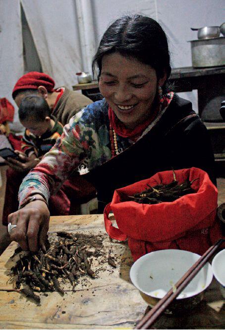 阻击外来人 在虫草为当地人带来更多收益的同时,虫草产地也吸引了众多外来人,并且因争抢资源而发生冲突。早年间,很多地方在虫草季因为管理不善,导致过多外来人进入,引起了严重的群体事件。据一位苏鲁当地的采挖者回忆,在2000年初,虫草采挖季节时常会有打人事件发生,甚至导致人员伤亡。 因为苏鲁乡虫草资源丰富,长期以来都是采集者大量涌入的地区。据当地数位村民回忆,在2005年,因为虫草采挖而爆发的冲突最为严重。当时苏鲁的邻县囊谦来的几千名采挖者被苏鲁本地牧民集体阻拦进入,双方因冲突导致多人受伤和一人死亡。而同样的时间段,藏区其他一些地方也相继出现了虫草季的争端和伤人事件。自2006年起,玉树州以及杂多县分别下文,专门加强虫草季人员的管理。 据杂多县一位官员介绍,杂多全县6万多人,如果不进行有序管理,就会进入大量的外地人,引发矛盾冲突甚至带来安全隐患。因此,目前杂多的政策是“县外禁止采挖,县内有序流动,”他解释说,“县内非虫草产区乡镇的人员可以进入虫草产区的乡镇采挖,按要求向进入地区的村缴纳虫草采挖费每人1200元。”该官员补充道:“而孩子、老人按照身体状况实行减免费用。” 为了避免过度采挖对生态和草场的破坏,杂多政府规定,每年的虫草采挖时间严格控制在5月15日至6月30日。以苏鲁乡为例,其他非虫草产区的本县人员在5月15日之前和6月30日之后都不允许进入苏鲁采挖虫草。 苏鲁乡乡长嘎松告诉《中国新闻周刊》,今年,本县进入苏鲁采挖的外来人员共有6000多人,而去年有大约7000人,苏鲁本地人口却仅仅2753人。外来人员的进入势必很大程度地影响到本地牧民虫草收获的数量和利益,给本地带来很大的损失。 “作为补偿而象征性收取的虫草采挖费用每人1200元,一个成年人一般一天就可以凭挖的虫草赚回来,而苏鲁乡多晓村虫草费收入今年大概有600万元,扣除管理费用,剩下的钱将全部分给村民。”苏鲁乡的扎西宁玛书记认为,这一切都是为了保证全县的稳定,在此过程中,包括苏鲁乡在内的部分虫草主产区的牧民做出了很大牺牲。嘎松算了一笔账,按照一个虫草季每个成年人平均采挖虫草收益两万元的保守估计,进入苏鲁的6000人就是带走了1.2亿元收益,可见虫草产地的一个乡村给整个杂多县做出的贡献之大。 为了有效管理外来人员进入,在苏鲁乡境内,在主要路段一共设立了4个大的卡点,而山上与囊谦县和西藏丁青县交界处的各个垭口,还设有10个卡点。乡领导和县一些部门的公务人员分别被下派到不同卡点,在整个虫草期间,24小时在岗,以防有外来人员非法进入偷采。 苏鲁乡公安局局长罗松桑丁告诉《中国新闻周刊》,这几年加强管理效果明显,“现在可以保证没有大事件发生,当然小摩擦在所难免。”罗松解释道,如果村民在采挖虫草过程中或者干部巡山时发现有越界采挖的邻县人员,都会采取和平劝退的方式。“加上现在老百姓观念改变,素质提高,更加守法,治安已经大为改观。”罗松说。 此外,出于生态环境保护的目的,虫草采挖期间,按照当地的佛教传统,杂多县规定在藏历的10号、15号以及30号,不许挖虫草。这个时间各乡村的村民负责周边草场的垃圾清理,将已有的垃圾运输到垃圾集散点,村民也可以利用休息日到县城采购补给,售卖采挖的虫草或者在家休息。 5月24日恰逢藏历初十,记者在走访牧户时确实看到山坡上没有人员采挖。“按照我们藏传佛教的传统,如果这些特殊日子还动土挖虫草的话,会特别不吉利,因此我们都不会在这几天上山。”22岁的藏族青年格嘉对记者说。  拉加老人,63岁,从100多公里外的莫云乡来到苏鲁采挖虫草。因为一些地区没有虫草,杂多县允许县内人员流动采挖:每人缴纳1200元的虫草采挖费,即可进入虫草产区。
