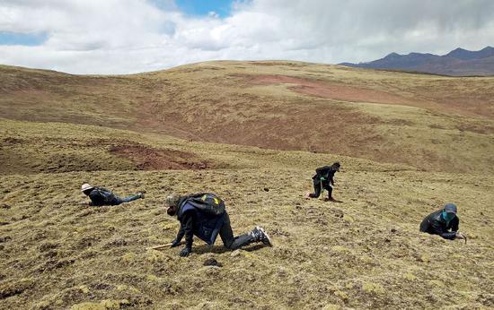 出于对虫草市场未来的忧虑 他们担心有朝一日 虫草会像早年藏獒市场那样 一下子就破灭掉  一群苏鲁年轻人在山坡上采挖虫草。他们都是20岁左右的年轻人,体力好的一天可以翻越几个山头找虫草。