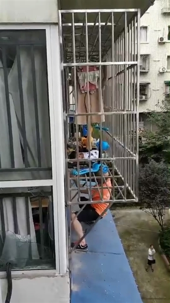 此刻,另一名邻居也携带钳子爬到了刘兴昭的身边,然后把护栏夹断后,身材比较瘦小的刘兴昭就利用这个空隙钻了进去,把孩子抱进屋内。刘兴昭说,进入屋内后,他发现屋中还有一名小女孩在哭泣。随后,邻居和赶到的绵阳特巡警民警将房门破开,孩子的奶奶、妈妈也回到家中,看到两个孩子并无大碍,众人悬着的心才放了下来。