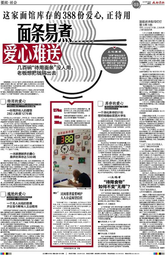 望着墙壁上388这个数字,老板杜军很犯愁。原本是希望传递爱心和信任,爱心却一直“库存”。最近,杜军和合伙人石永莉想把这笔库存捐给一位家庭困难、即将入学的大学生,但又纠结这会不会违背爱心的初衷? 三年多前,四川宜宾一家面馆开业时引入了国际上流行的“待用食物”理念,根据面馆实际情况推出“待用面条”,截至今年三月,市民们购买了1276碗“待用面条”。但是,用出去的却寥寥无几。 待用的爱心 “他制作了专用的免费餐票,凭此可取得和付费客人同样的用餐小票,以示对取食者的尊重” 一份周济他人的理想 282人购买1276碗 杜军是土生土长的宜宾人,早年间,在一本杂志上读到国外“待用咖啡”故事,深有感触。前几年,杜军因为家人生病住院,越来越感觉“待用食物”体现的人性光辉。 2014年下半年,迫于生计的杜军继承了岳母做面的传统手艺,打算开家面馆,并通过面馆实现“待用食物”周济他人的理想。杜军的想法,得到了亲朋好友和合伙人石永莉的支持。 2014年9月16日,面馆如期开业。石永莉、李漫侠等10名同学,购买了268碗“待用面条”,寄存在面馆,任何需要的人都可以免费取用。为了让人们知道面馆提供免费待用面条,杜军在店内和店外的墙上做了广告,希望看到的困难群体主动入店取用。 “我们按每碗二两的标准,来制作‘待用面条’。”杜军告诉成都商报记者,为了防止取用者产生自卑感,他制作了专用的餐票,取食者向收银台支付餐票,取得和付费客人同样的用餐小票,以示对取食者的尊重。 截至今年三月,共有282名客人购买了1276碗“待用面条”存在面馆,价值11485元。其中,既是面馆合伙人,又是杜军同学的石永莉,一个人就买了168碗。 一本越攒越多的善心 最多时库存达500碗 面馆开业当天,购买数量达到268碗; 此后,陆陆续续有客人用餐后购买“待用面条”存放。为了方便管理,杜军准备了一个专门的笔记本,来记录每一笔“待用面条”的购买时间、金额。对于客人,杜军通常建议其留下电话。“大家都是出于一片善心,也是对我们的信任,因此没有人真正留下过联系方式,甚至很多人的姓名都不是真名。” 成都商报记者注意到,杜军记录“待用面条”购买清单的笔记本,已经记了整整26页。小到小数点后面的零头,都有完成的记录,清晰可查。此外,杜军在墙上贴了个数字显示器,每日公示“待用面条”的库存数量,保证购买者知情和监督。记账的本子也挂在公示墙上,任何人可以随时查看。 “自从面馆开业以来,‘待用’面条从来没有用完过。”杜军告诉记者,三年多来库存数一直保持在300-400碗之间的高位,最多的时候库存数达到500碗。而即使目前杜军将面馆交给了石永莉打理,库存也有388碗之多,而且仍然有顾客购买。 尴尬的爱心 “但也不是每个受赠者都愿意来取用。送出去30碗,一次也没有来吃” 一个无人光临的窘境 开业至今鲜有人主动取用 杜军和他的“待用面条”从诞生开始,包括成都商报在内的多家媒体,曾报道过这种公益新模式。但是“待用面条”本身,却未被公众完全接受。从开业到现在,鲜有人主动来取用“待用面条”。 “印象中,有一对高县大窝镇的老年夫妇,老头在面馆对面医院住院,眼疾很重,家庭困难。”杜军回忆,当时医院的护士长见他们可怜,便告知他们可以来面馆取用免费待用面条。“老人抱着试一试的态度走进面馆,从此每天来,吃了一个星期。”杜军说,最让他感动的是,老人出院后曾专门给面馆送来花生。 如何让需要的人接受并取用“待用面条”,杜军很伤脑筋。“没人主动来,我们就联系医院、社区,给困难群体送取餐票。”杜军告诉记者,面馆每个月都要给附近社区的困难老人和环卫工人送餐票,库存基本保持平衡。 根据当前的数据不完全统计,目前一共送出888碗(餐票)“待用面条”。杜军保守估计,真正使用率达80%以上,被取食700余碗。“有些人可能遗失了,有些医院护士手中还有余票(赠送给困难病人的)。”杜军表示,希望更多需要者主动来取食,而不是面馆定向去送餐。 但也不是每个受赠者都愿意来取用。石永莉说,三个月前屏山有个村民在山上采药被熊咬伤,家庭比较困难,又面临巨额治疗费。面馆主动送去30碗“待用面条”餐票,结果对方一碗都没来吃。“我们后来联系到对方,结果病人把餐票也弄丢了。” 库存的爱心 “面条的库存数仅仅是个数字,没有发挥应有的作用” 一个消化库存的计划 想把钱捐给贫困大学生 今年以来,杜军因为父亲患病需要照顾,实在无暇顾及面馆生意,于是将其交给石永莉打理。“每天五点就得起来上班,累得不行。”最让石永莉为难的,不是第一次经营面馆所面临的劳累,而是面对库存的388碗“待用面条”,如何及时“消化”下去。 “‘待用面条’这个公益项目,也算是我和杜军一手做起来的,我们的初衷是希望这些钱、面发挥助危济困的作用,而不是躺在账上睡大觉。”石永莉说,她经营半年后,感觉“待用面条”没有及时被人取用,面条的库存数就仅仅是个数字,没有发挥应有的作用。 经过和关注“待用面条”的志愿者商量,石永莉和杜军决定取出其中3000元现金,直接资助给一名今年考上大学的贫困大学生。“一次性资助3000元,我们留存的面条仍有50碗左右。”石永莉认为,这个才是合理库存数,既能帮到别人又不影响“待用面条”发挥该有的作用。 “客户购买