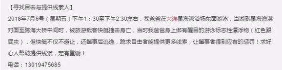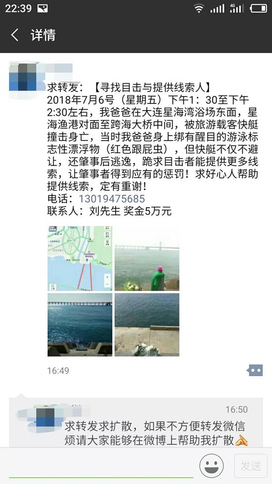 内容如下:2018年7月6号(星期五)下午1:30至下午2:30左右,我爸爸在大连星海湾浴场东面游泳,当游到星海渔港对面至跨海大桥中间时,被旅游载客快艇撞击身亡,当时我爸爸身上绑有醒目的游泳标志性漂浮物(红色跟屁虫)。但快艇不仅不避让,还肇事后逃逸,跪求目击者能提供更多线索!让肇事者得到应有的惩罚! 于此同时,这条求助信息也很快在微信朋友圈中被转发,转发信息中增加了“悬赏5万元”的信息。