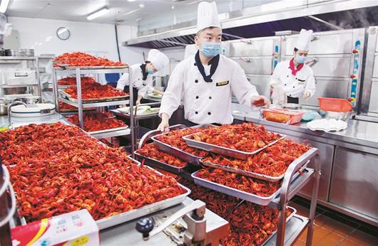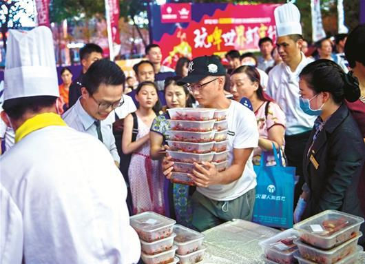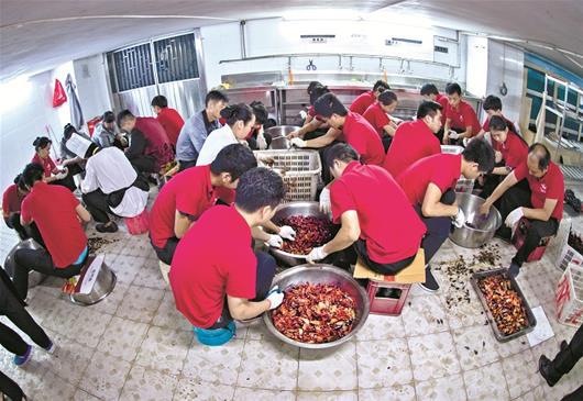 前日晚7时30分,街头热浪腾腾,超过4千市民在武昌友谊大道友谊国际家居广场排起了长龙,排队领取期盼已久的油焖大虾。主办方准备了3吨油焖大虾,在广场上和地下负一楼摆放了数百张桌子,并在广场上搭起舞台,请来劲爆的摇滚乐队,大家一边吃虾子喝啤酒,一边观看劲爆歌舞。 据主办方友谊国际家居负责人介绍,这次活动在20天前就开始策划,工作人员提前售出了7千多张“夜袭卡”,市民花20元买到该卡后,凭卡在活动当晚可以领取一份油焖大虾和冰啤酒。当晚,主题为“玩啤世界虾客行”的活动爆棚,炎炎夏日里市民们的热情不减,早早地在活动现场排起了200多米长的队伍,激情豪迈地在现场吃虾喝啤酒,还做起了与虾有关的互动游戏。 负责烹制这批小龙虾的友谊国际大酒店大厨徐贵洪告诉楚天都市报记者,在6月底就接到要制作3吨油焖大虾的通知,他们特意派人去潜江寻找优质虾源,抽调了140人的队伍来制作这批油焖大虾。“3吨小龙虾陆续从潜江运来,我们临时抽调了50人的队伍专门分拣、清洗,60名厨师、12口大锅同时开火烧制,由30人加班加点分装成小盒包装,耗时两天。” 前来吃虾的李先生告诉记者,“喝着啤酒吃着虾子,还能看劲爆的歌舞,所有夏天该有的元素齐聚这里,武汉的夏天就要这么过才有味。”  图为:制作好的半成品小龙虾源源不断地用小推车推进厨房