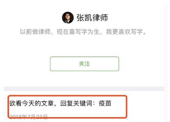 做了3年每经小编(微信号:nbdnews)也感到迷茫了,推送后的文章在微信后台只能修改几个字,但张凯律师是怎么做到不停修改付款码的呢? 对此,知乎作者@辩手李慕阳表示,张凯律师演绎了一次经典的新媒体营销,请注意以下细节: 1、这篇文没有推送,而是用了关键词触发素材。 2、因为没有推送,付款码可以不停修改。 3、因此,张凯律师可以绕过微信的限额和监管,不断修改付款码,收到诸位打款。 ——原来,张凯律师是让读者通过回复“疫苗”二字收到该文章,通过这种操作,作者可以不断更换二维码来获得赞赏。