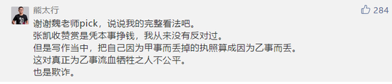 知名自媒体人魏武挥就在其微信公众号扯氮集中表示: 总之,短短一个上午过后,张凯就从一个充满情怀的前律师,变成了一个让人“可恨的”(我一个朋友语)“发国难财的”(我又一个朋友语的)“吃人血馒头的”(我另一个朋友语的)“败坏自 媒体风气的”(还是一个朋友语的)“涉嫌欺诈的”(我这样的微信朋友还真不少,哈哈哈)卑鄙小人。 但魏武挥认为,这篇文章最后二维码的上方写的很清楚:卖文为生,给多给少也是读者的意愿;也不能因为觉得看了文章觉得张凯律师是个有情怀的人,就不该爱钱(更换付款码收取更多打赏)。 内容创业者熊太行在稍后表示,张凯收赞赏是凭本事挣钱,我从来没有反对过。但是写作当中,把自己因为甲事而丢掉的执照算成因为乙事而丢,这对真正为乙事流血牺牲之人不公平,也是欺诈。
