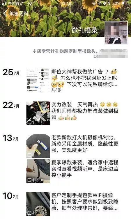 根据读者提供的信息,记者以顾客的名义找到了这家名叫“微孔摄录”的微店,果然在这个微信号的朋友圈里,经常会更新各类隐蔽针孔偷拍设备的信息,叫卖着伪装成各种产品的针孔摄像头。