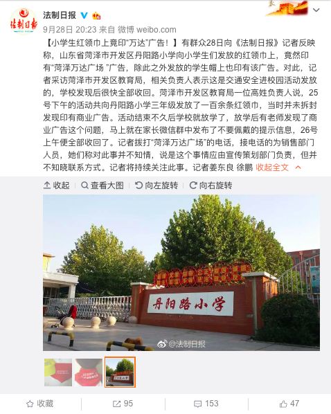 据@法制日报报道,有群众28日向《法制日报》记者反映称,山东省菏泽市开发区丹阳路小学向小学生们发放的红领巾上,竟然印有“菏泽万达广场 ”广告,除此之外发放的学生帽上也印有该广告。