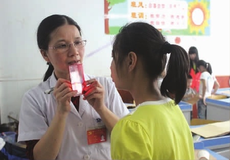 湖南省儿童医院眼科主任陶利娟在为孩子做相关视力检测。