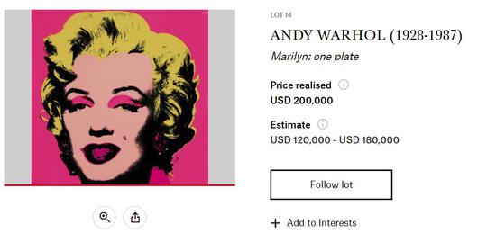 “这幅画作和佳士得250多年以来所拍卖的所追求的艺术品并无二致,”佳士得拍卖会的组织者理查德·罗伊德(Richard Lloyd)表示。 最初,该画起拍价定在5500美元,估值7000-10000美元。但历经55次出价后,终以35万美元落锤。加上佣金和其他费用,总价43.25万美元,是估值上限的40多倍。值得一提的是,波普艺术开创者安迪·沃霍尔的一幅画作:玛丽莲·梦露 (Marilyn:One Plate, 1967),在拍卖会上以16万美元落锤,总价20万美元。  图片来源:截自佳士得官网