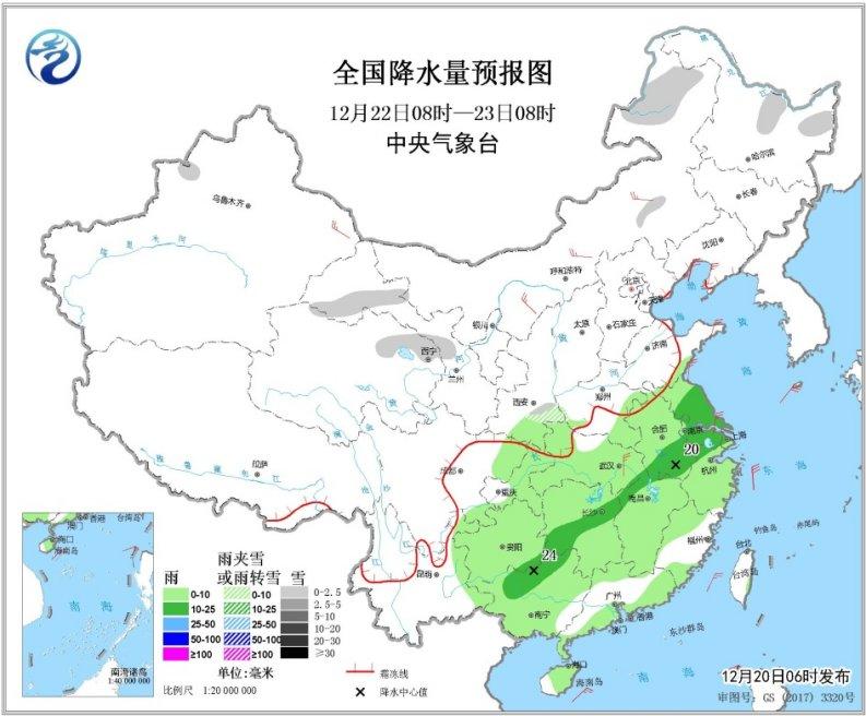 转图失败--> 南方地区多阴雨 20日至22日,南方地区多阴雨,江淮、江汉、江南、华南大部、西南地区东部和南部等地有小雨或阵雨,部分地区中雨,局地大雨。 中等强度冷空气影响北方地区 21日至23日,中等强度冷空气影响我国北方大部地区,新疆北部、甘肃中北部、内蒙古大部、东北大部、华北等地先后有4~5级偏北风,新疆山口地区风力可达6~7级,气温随之下降4~6℃,局地降温可达8℃以上。 未来三天具体预报 12月20日08时至21日08时,新疆北部和东南部、青海中部、甘肃东南部及河北东北部、东北地区中南部等地的部分地区有小到中雪或雨夹雪,其中,新疆北部局地有大雪或暴雪(5~11毫米)。西南地区东部、江汉西部、江南、华南大部等地有小到中雨。新疆北部、内蒙古中西部、甘肃、青海、陕西北部、河北北部等地的部分地区有4~6级风。(见图2)。东海北部海域将有5~7级、阵风8级的旋转风。  图2 全国降水量预报图(12月20日08时-21日08时)