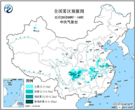 昨日云南江苏江西等地部分地区降中到大雨 局地暴雨 昨日,西藏东部、四川西北部、新疆北疆北部等地降雪或雨夹雪1~8毫米;云南西部、江苏西南部、江西西北部等地部分地区降中到大雨,云南临沧局地暴雨(50~89毫米)。 今晨,河南东南部、安徽中南部、湖北中西部、湖南中北部及四川东部、重庆西南部等地出现能见度不足1公里的大雾,局地能见度不足200米。 华北黄淮等地有霾 20日,华北中南部、黄淮、汾渭平原等地有轻至中度霾,部分地区有重度霾;21至23日,受冷空气影响,上述地区霾天气减弱或消散;24日,华北中南部、黄淮西部等地大气扩散条件再次转差,有轻至中度霾;25日至26日,受较强冷空气影响,上述地区霾天气减弱消散。此外,20日早晨至上午,河南东部、安徽中部、江苏北部和西部、湖北中东部、湖南北部、四川盆地等地的部分地区有大雾,其中,江苏西部、湖北中部、四川盆地的部分地区有能见度不足200米的强浓雾。中央气象台12月20日06时发布大雾黄色预警。  图1全国雾区预报图