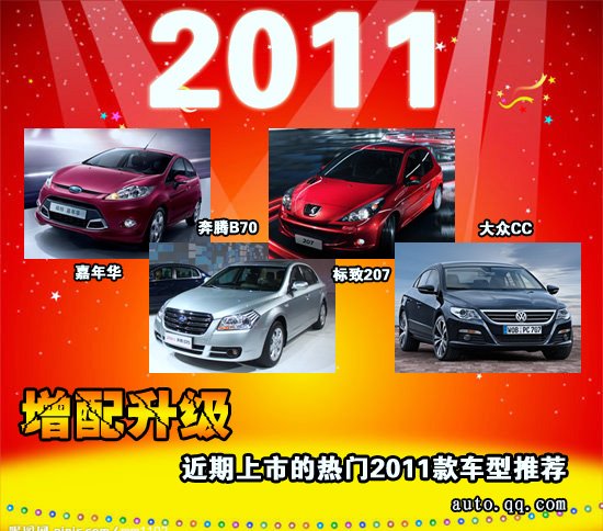 | 车型 | 上市日期 | 市场指导价 | 2011款福特嘉年华 | 5月20日 | 7.99-11.29万元 | 2011款奔腾B70 | 5月18日 | 13.18-16.58万元 | 2011款标致207 | 5月18日 | 7.18-10.58万元 | 2011款一汽大众CC | 4月18日 | 25.38-30.08万元 | |